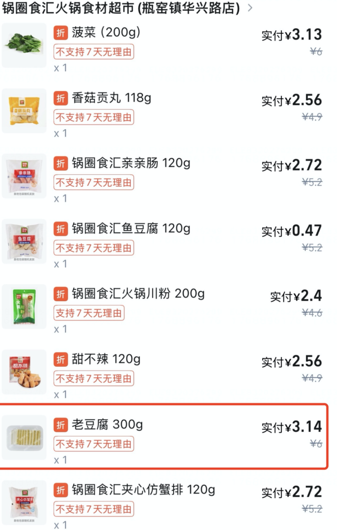 近日,杭州一消费者反映,1月15日通过外卖平台正在连锁品牌“锅圈食汇”订购的食材中,保质期仅2天的老豆腐。经多方协商,门店最终补偿该顾客300元。