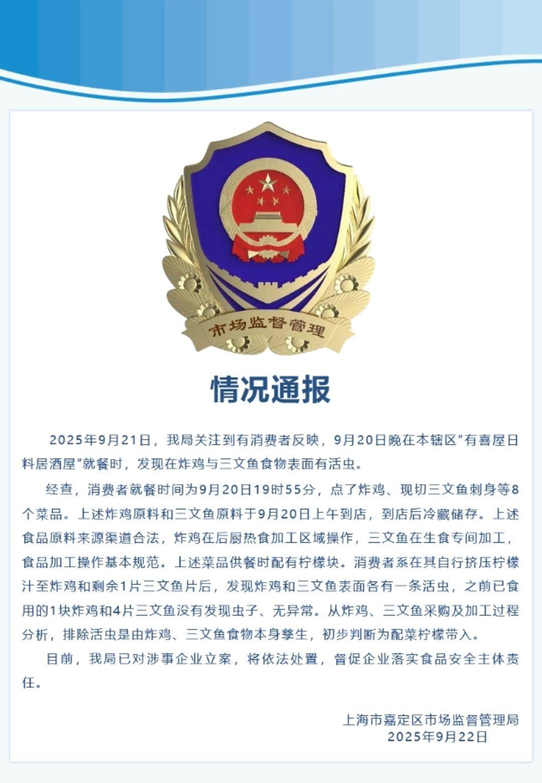 2025年9月21日,我局关心到有消费者反映,9月20日晚正在本辖区“有喜屋日料居酒屋”就餐时,发觉正在炸鸡取三文鱼食物概况有活虫。经查,消费者就餐时间为9月20日19时55分,点了炸鸡、现切三文鱼刺身等8个菜品。上述炸鸡原料和三文鱼原料于9月20日上午到店,到店后冷藏储存。上述食物原料来历渠道,炸鸡正在后厨热食加工区域操做,三文鱼正在生食专间加工,食物加工操做根基规范。上述菜品供餐时配有柠檬块。消费者系正在其自行挤压柠檬汁至炸鸡和残剩1片三文鱼片后,发觉炸鸡和三文鱼概况各有一条活虫,之前已食用的1块炸鸡和4片三文鱼没有发觉虫子、无非常。三文鱼采购及加工过程阐发,解除活虫是由炸鸡、三文鱼食物本身孳生,初步判断为配菜柠檬带入。